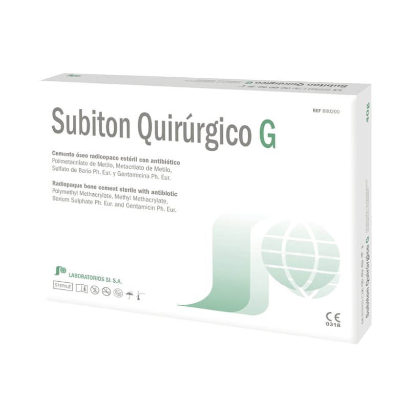 Subiton Quirúrgico G está indicado para cementaciones protésicas en ortopedia y traumatología, especialmente en pacientes con mayor riesgo de infección o en procedimientos de revisión.