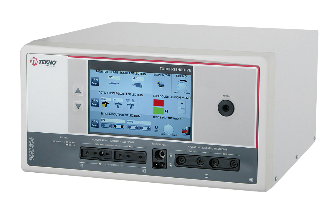 El TEKNO TOM 500 es una unidad de electrocirugía de alta frecuencia desarrollada para ofrecer precisión, potencia y seguridad en cada procedimiento. Su pantalla táctil de 7” permite una visualización clara de parámetros y acceso rápido a los programas, optimizando el flujo de trabajo en quirófano.